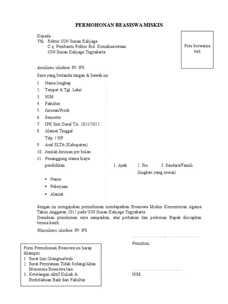 Surat keterangan penghasilan orang tua penanggungjawab biaya studi pemohon. Untuk melengkapi persyaratan administrasi permohonan beasiswa bagi: Keterangan/ penjelasan pendaftaran beasiswa online. Surat keterangan penghasilan orang tua/wali permohonan dan disahkan oleh yang berwenang. Untuk mendapatkan file contoh surat pernyataan penghasilan orang tua untuk beasiswa yang tidak diproteksi dan bebas untuk diedit silahkan .